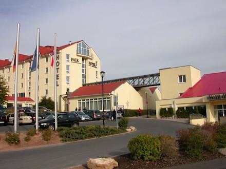 AußenansichtSo sieht das Hotel aus, wenn man von der Autobahn herunter fährt und vom Kreisverkehr sofort zum Hotel hinauf fährt. Das linke höhere Gebäude beherbergt die Zimmer, in dem rechten kleineren sind die Sportanlagen. Dazwischen ist der überdachte gläserne Verbindungsgang zu erkennen