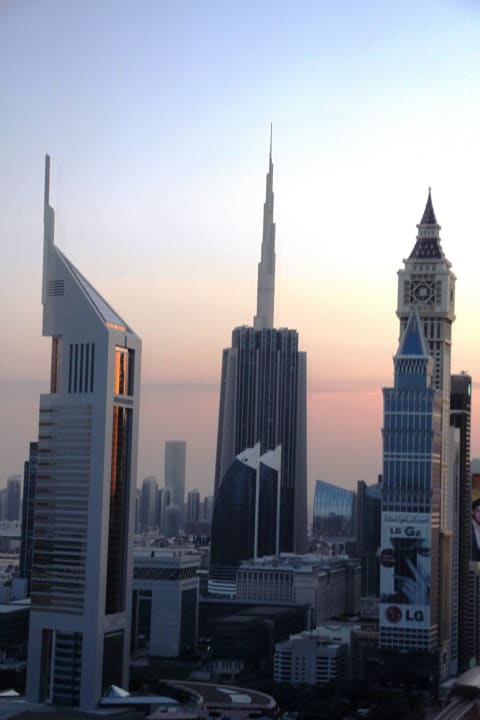Im Hintergrund überragt der Burj Khalifa das mittlere Hochhaus