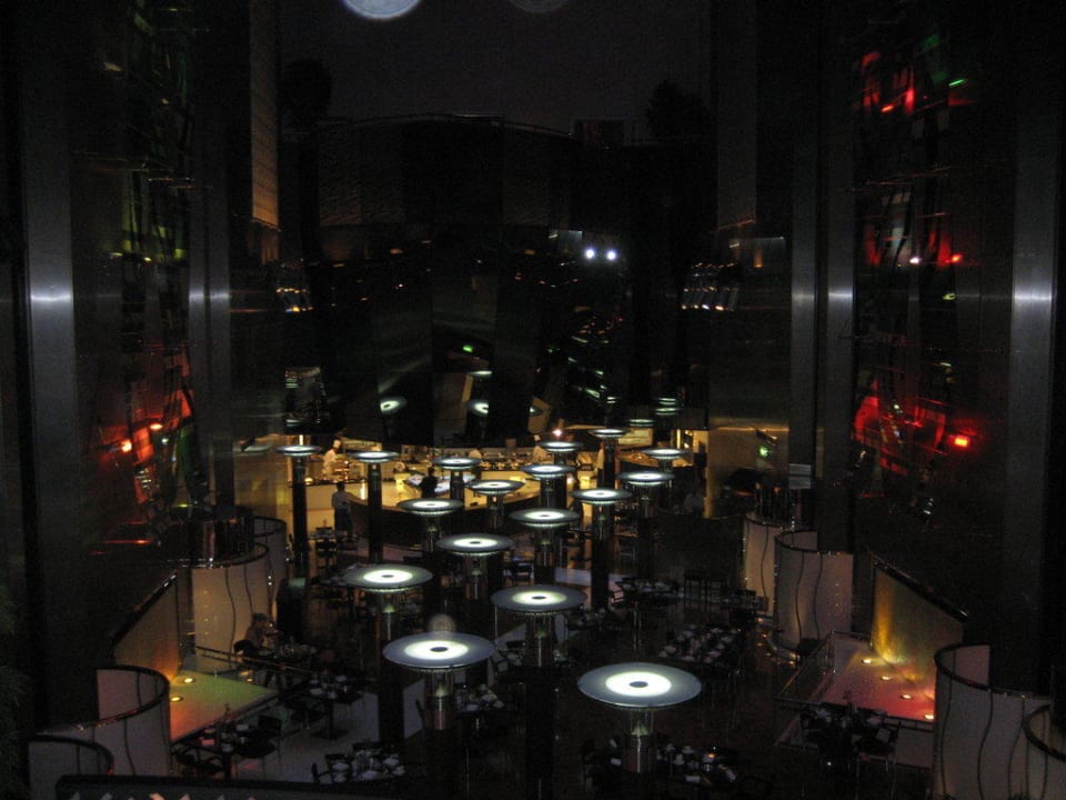 Übersicht vom 1. Stock auf das FrühstückscaféDer Frühstücksraum ist im Erdgeschoss hinter den Liftschachts angebracht.