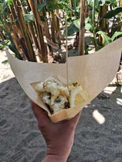 Frittierte Calamari und frittiertes Gemüse vom Imbissstand. Sehr lecker!