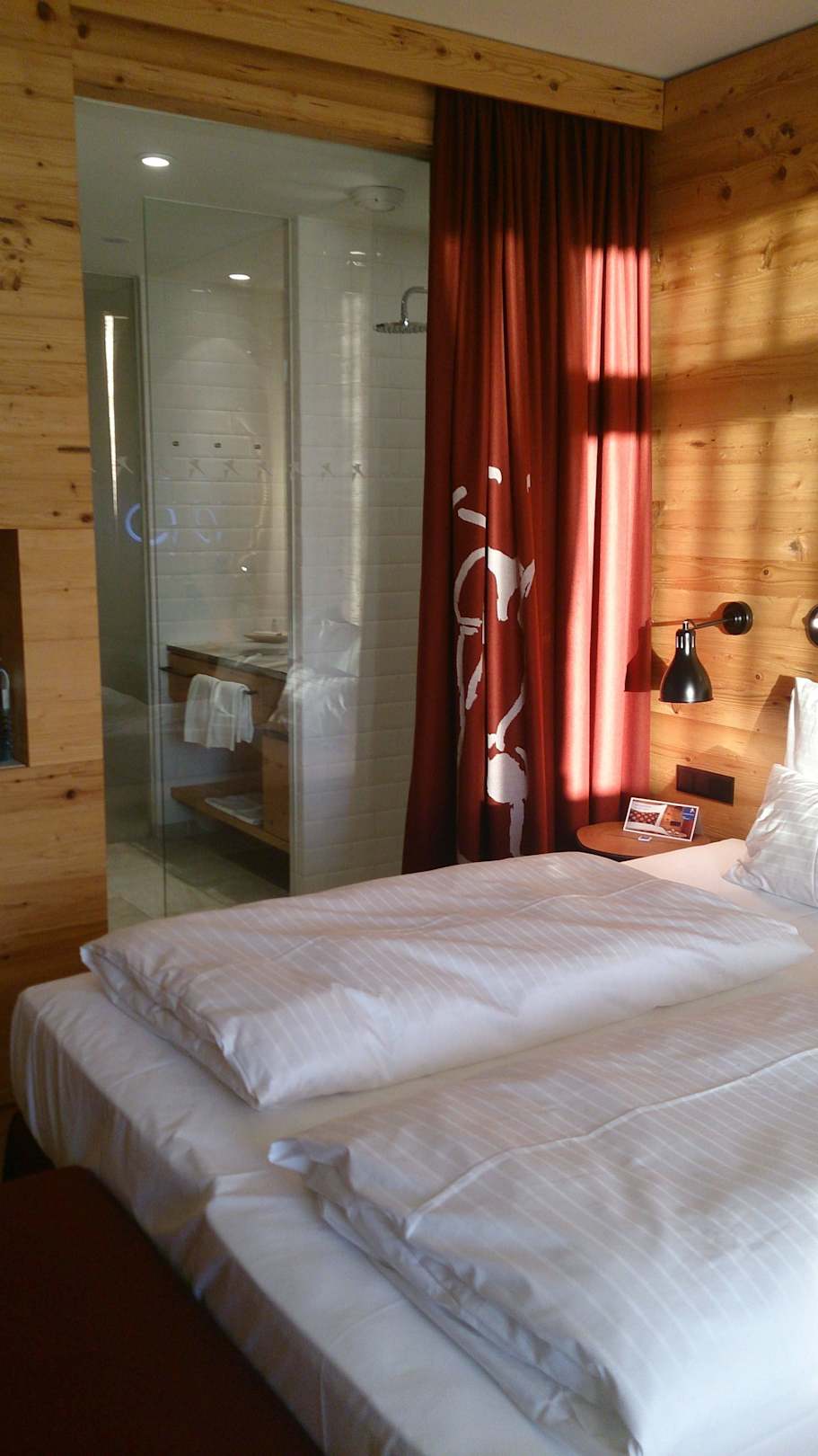 Geöffneter Vorhang mit Blick in die Dusche/Bad