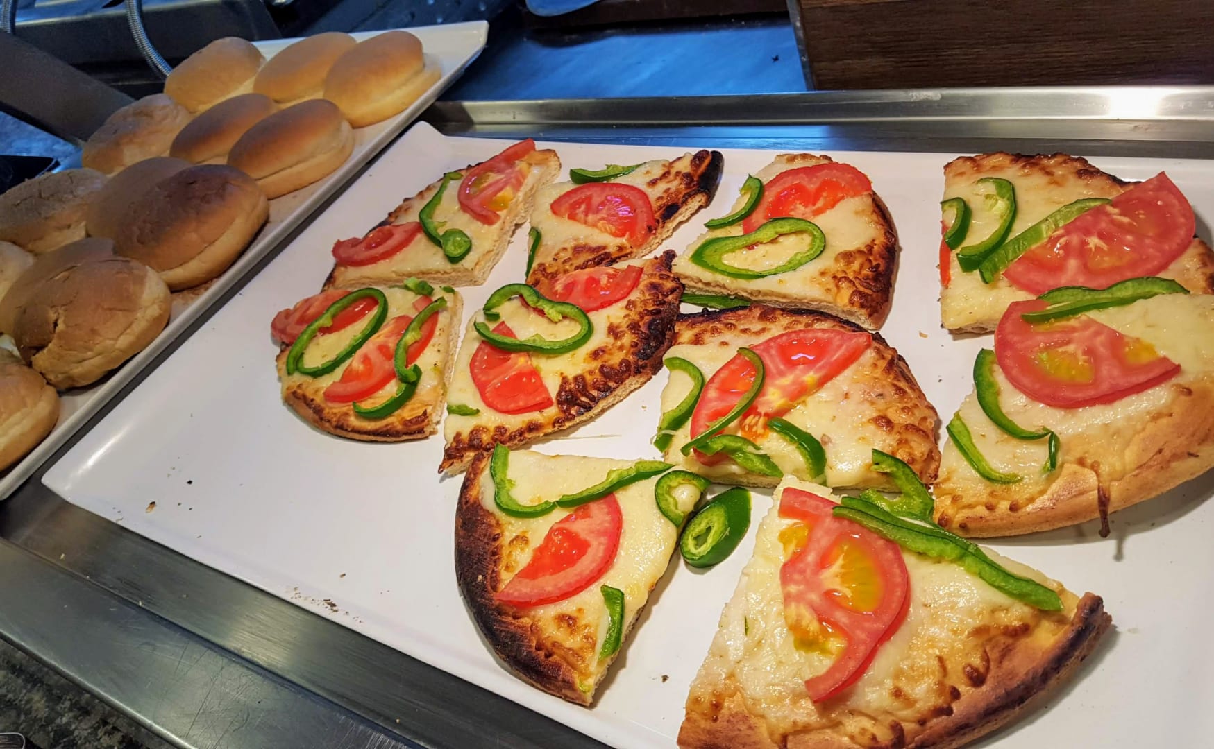 Abendessen (Dinner) mit Pizza und Hamburger.