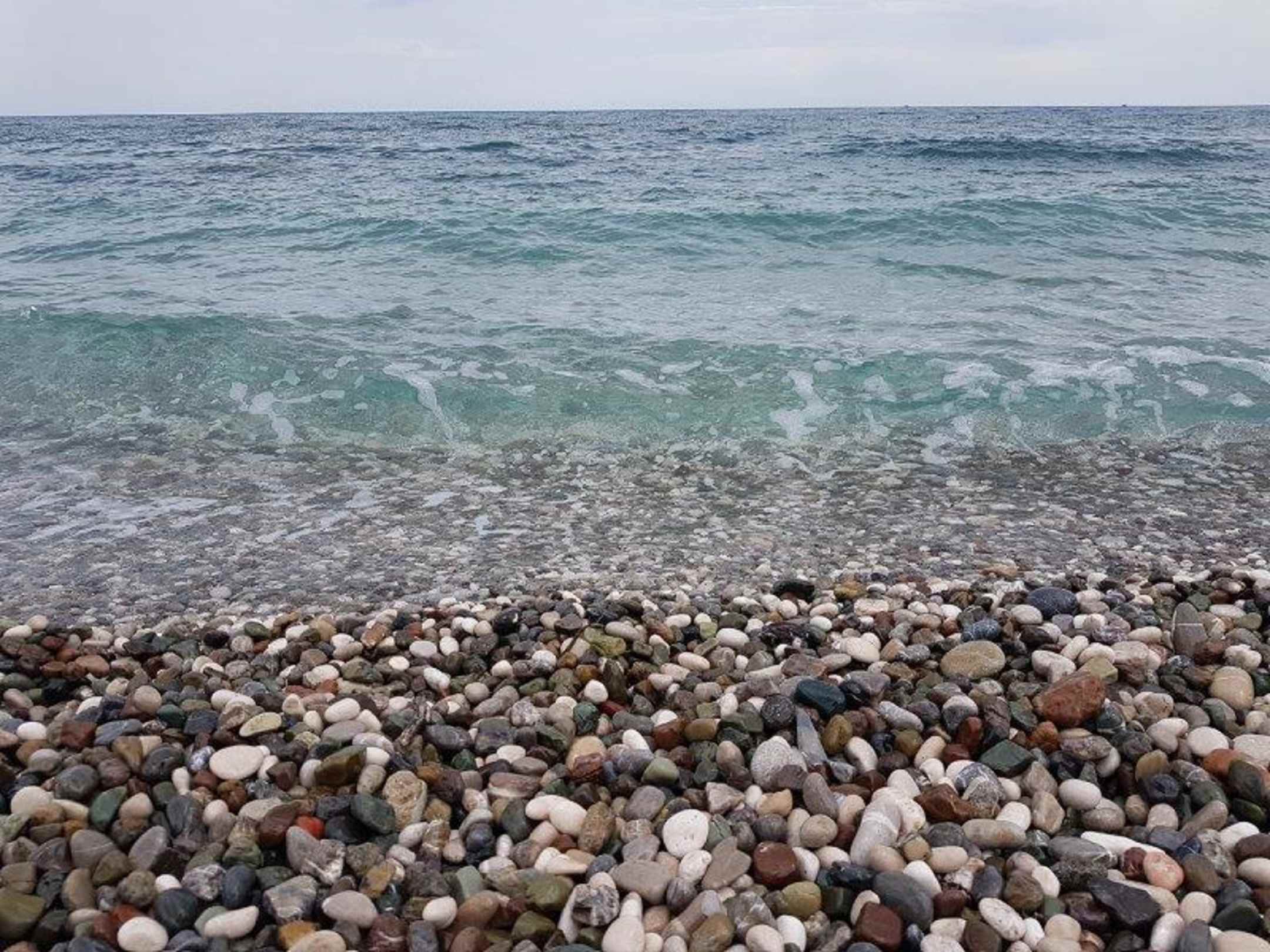 Kiesstrand und sauberes Meer.