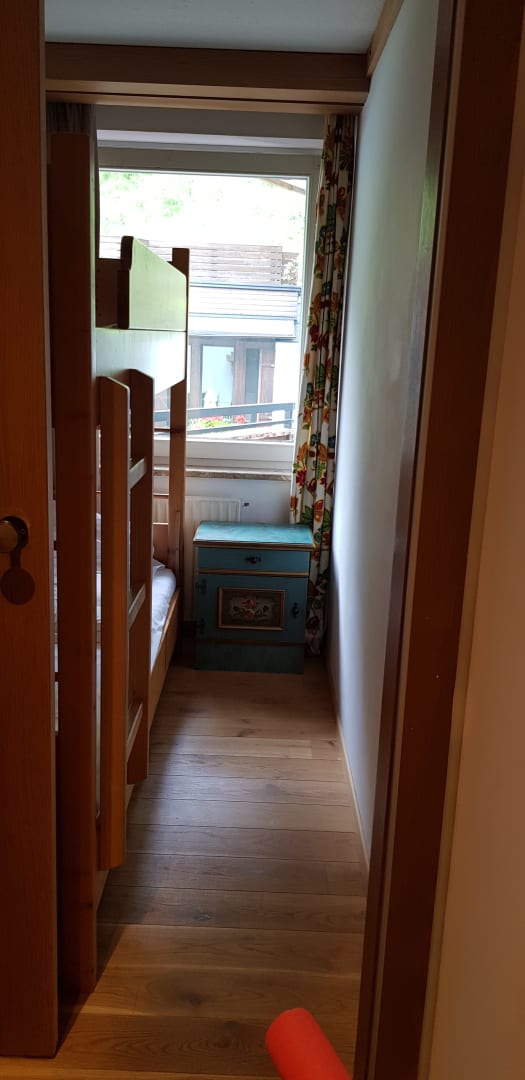 Kinderzimmer mit Stockbett und Aussicht in den Garten