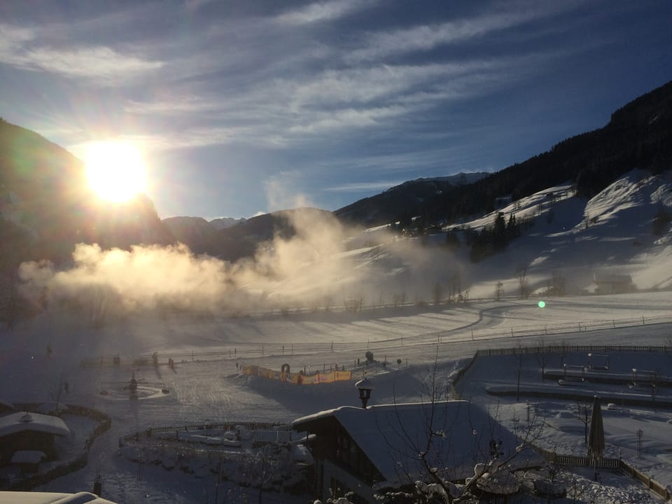 Morgendlicher Blick aus dem Fenster auf die Kinderskischule