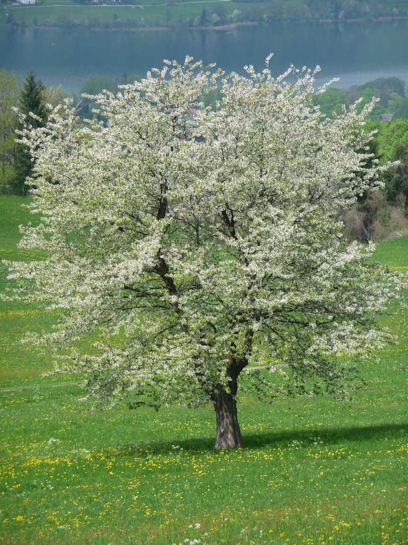 Blühender Kirschbaum vor dem Haus