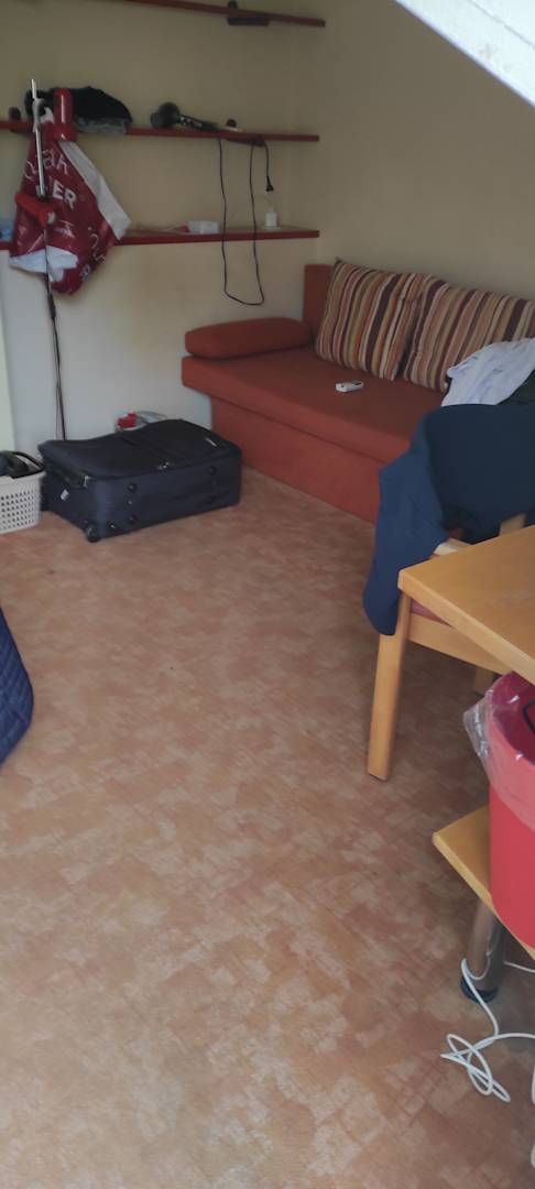 Verdeckter Teppichboden. Polster der Couch und der Stühle fleckig.