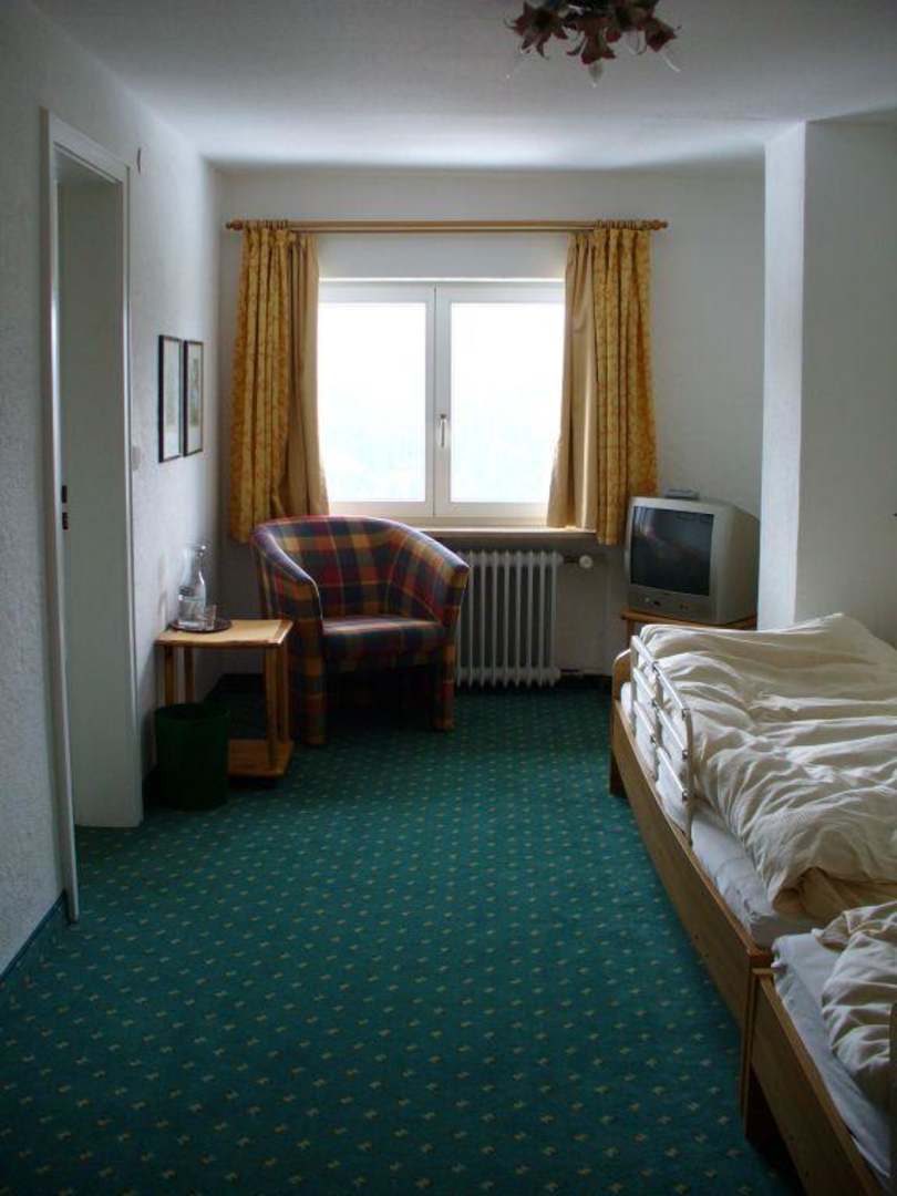 Kinderzimmer mit 2 hintereinander stehenden Betten mit Rausfallschutz, kleinem Fernseher und eigenem Bad. Zimmer ist mit kleinem flur mit dem Elternzimmer verbunden.