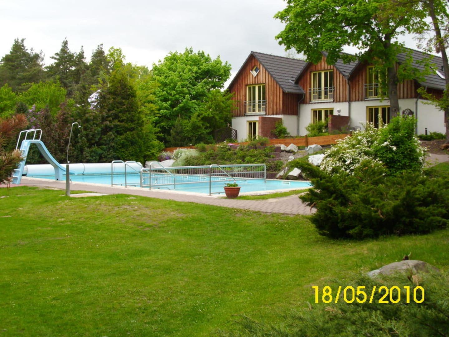 Poolanlage danhinter die Harzferienhäuuser.