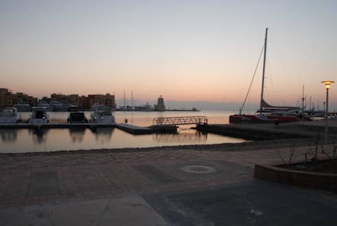 Ausblick vom Hotel ausBlick vom Hotel Fanadir über den Yachthafen in Richtung des Meeres bei Sonnenaufgang.