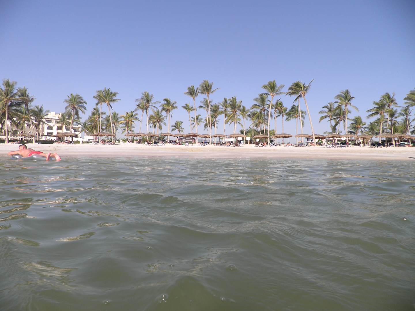 Meer hatte 28° C, Luft 30-32° C, da schaut man mal länger aus dem Wasser zum Strand
