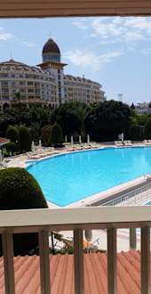 Ausblick vom Familienzimmer Richtung Pool.