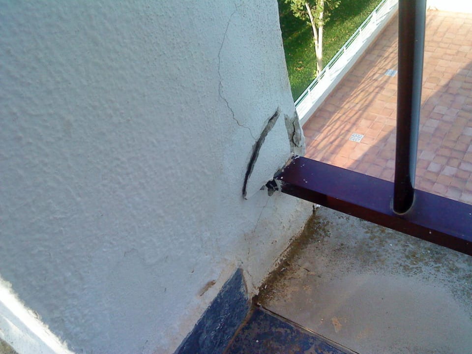 Bild zeigt die Verankerung des Balkongeländers. Auf den ersten Blick scheint es wäre nur etwas Putz abgebröckelt. Aber dadurch das dass Geländer durchgebogen wurde ist die Verankerung lose.