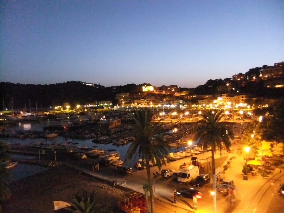 Blick von Dachterrasse auf abendlichen Hafen