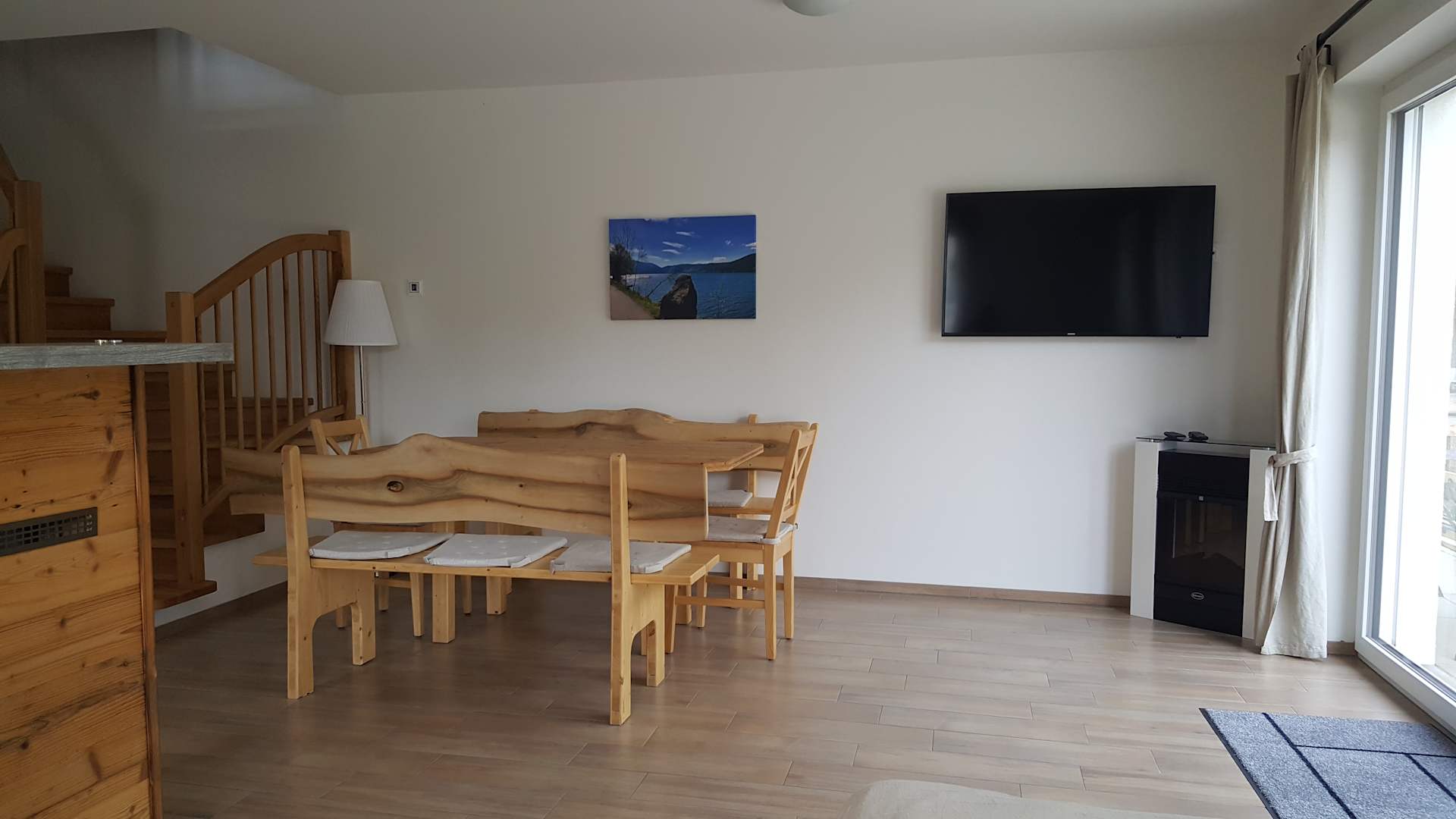 Sofabereich mit Blick aufs Smart-TV und Essecke