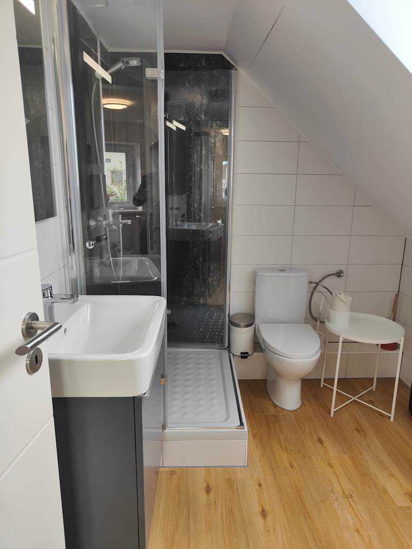 Badezimmer im 2. Stock, hier war das Duschen ein Erlebnis, da die Kabine nicht dicht war und der Abfluss nicht so funktionierte. Hatten immer eine Überschwemmung. Dachfenster zum Lüften.