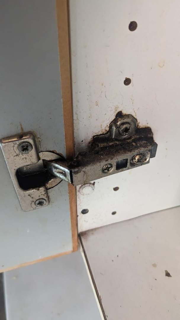 Küche. Geschirrschrank, dortiges Scharnier.