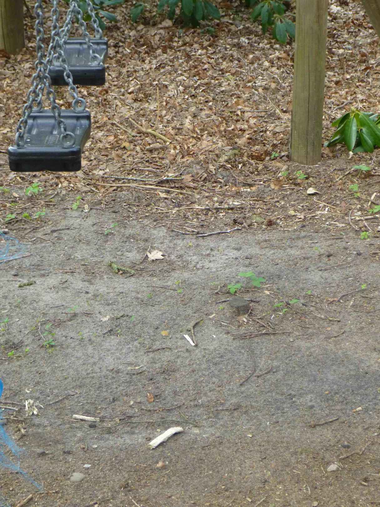Hier sieht man die total verrottete Spielecke. Die Farbe ist abgeplatzt, Splitter stehen überall raus, das Holz ist morch, unter den Schaukeln steht eine Wurzel raus. Ich würde hier kein Kind spielen lassen.