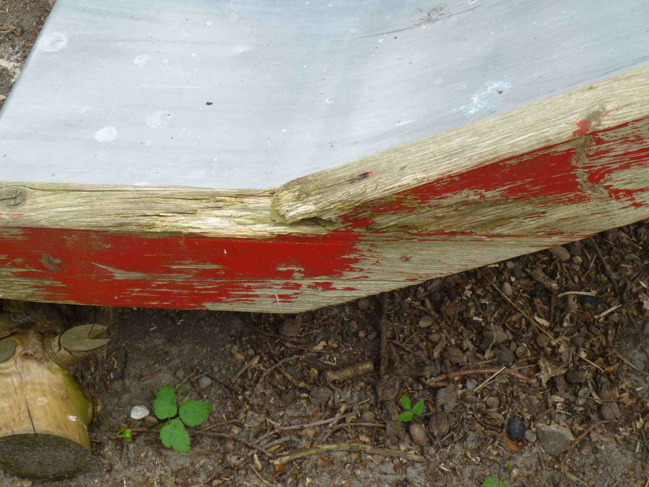 Hier sieht man die total verrottete Spielecke. Die Farbe ist abgeplatzt, Splitter stehen überall raus, das Holz ist morch, unter den Schaukeln steht eine Wurzel raus. Ich würde hier kein Kind spielen lassen.