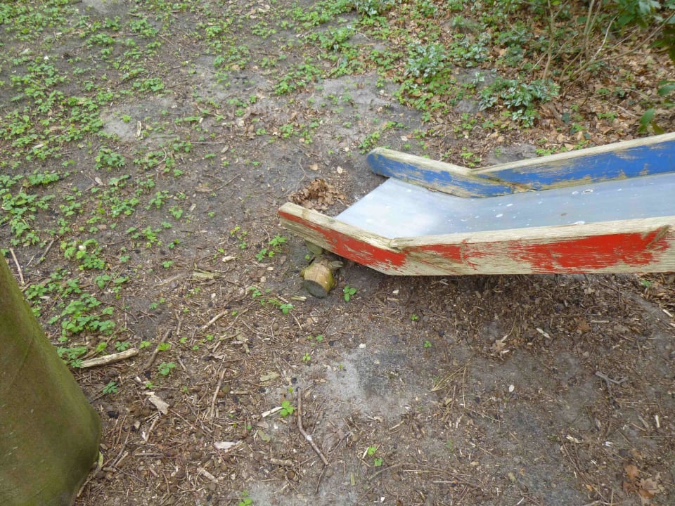 Hier sieht man die total verrottete Spielecke. Die Farbe ist abgeplatzt, Splitter stehen überall raus, das Holz ist morch, unter den Schaukeln steht eine Wurzel raus. Ich würde hier kein Kind spielen lassen.