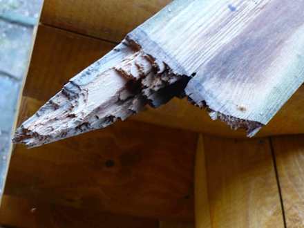 Das ist die runtergekommene Terrasse. Die Bretter waren teilweise so morch, das ich durchgebrochen bin. Viele Bretter waren morch, lose und es standen Nägel und Schrauben raus. Große Verletzungsgefahr besteht.
