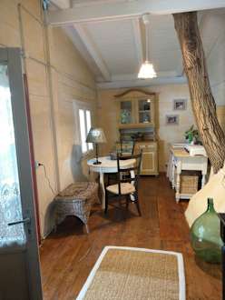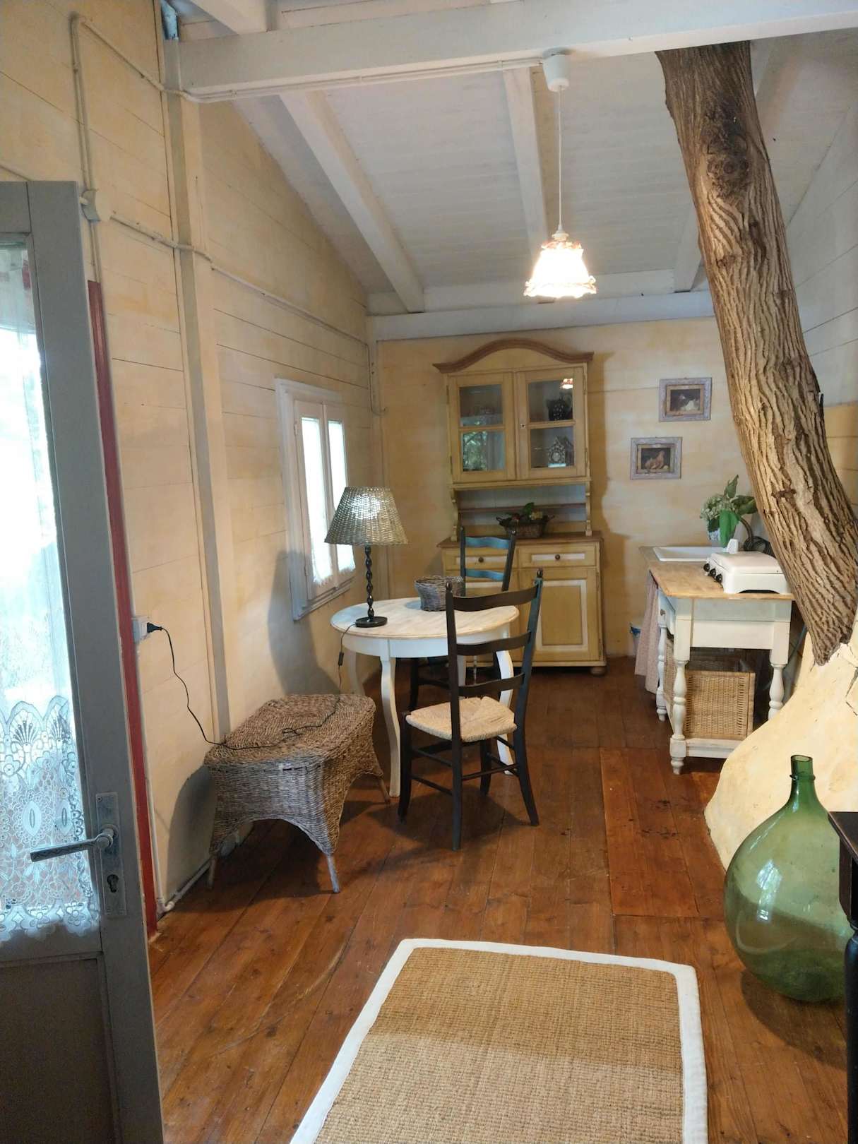 Gartenhaus: Innenansicht mit Walnussbaumstamm; Ausstattung: Gaskochstelle und Sitzmöbel