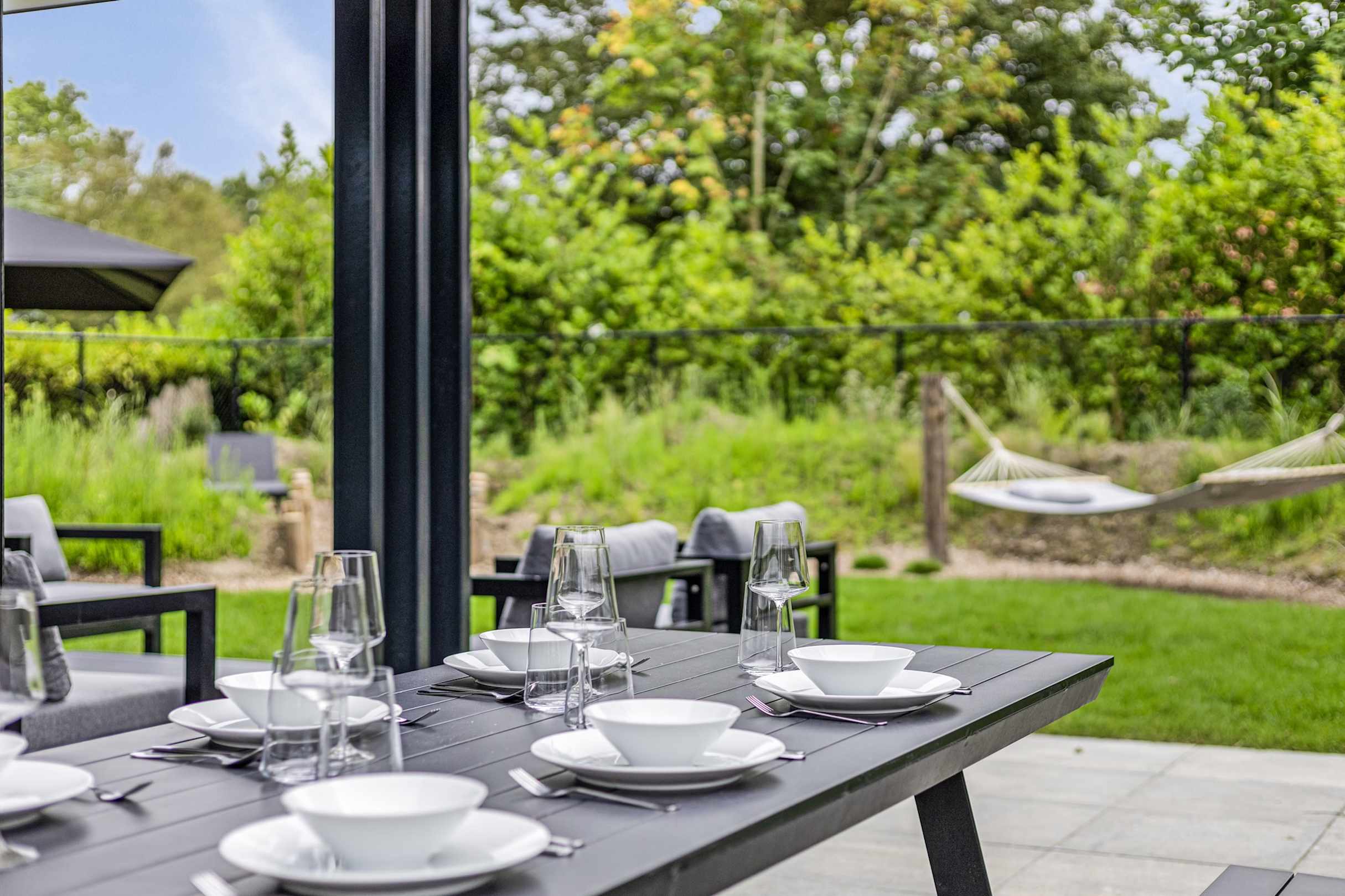 AußenansichtVollständig umzäunter Garten mit Hottub, Sonnenliegen, großzügigem Sitzbereich, Picknicktisch und Hängematte.