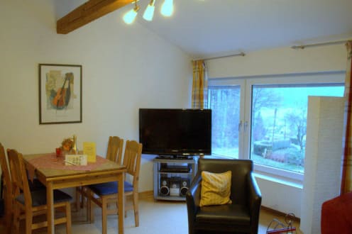 Essbereich im Wohnzimmer mit Flachbildfernseher