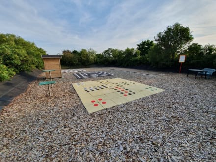 liebevoll durch Albert R. gestalteter Platz mit XXL-Spielen (Mensch ärgere dich nicht - Mühle - Schach) und Boule zur kostenfreien Nutzung. Ein (Riesen-)Spaß für die ganze Familie!