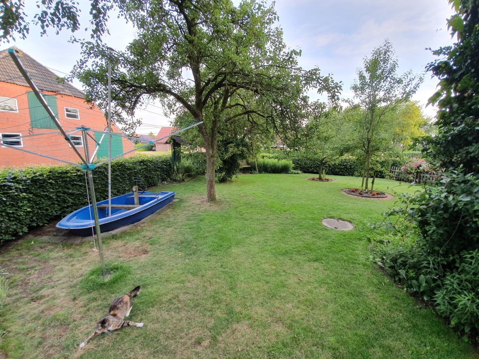 großer, gepflegter Garten der "Kornblume" mit Spieleboot für die Kinder und Hollywoodschaukel für die Großen (in der Mitte hinter dem Baum)