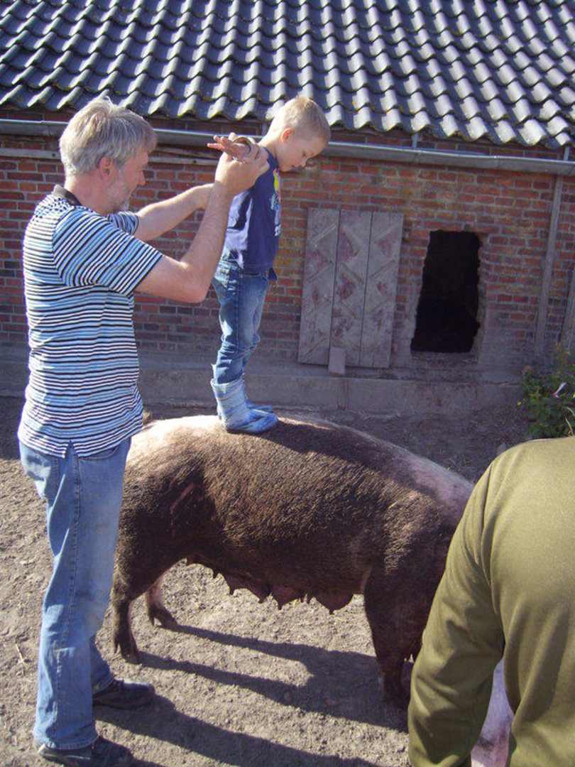 Eigentlich kann man auf der Sau sitzen, aber da Bauer Karl die Gerda grade abgeduscht hat, üben wir eben das balancieren. Das macht Spaß.