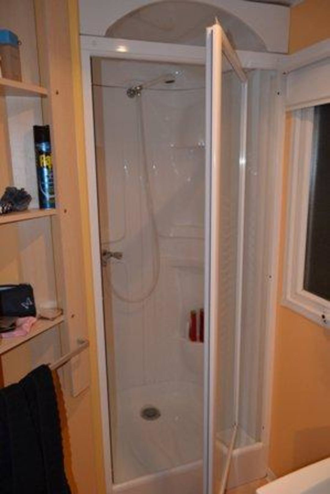 Dusche erschwert zu temperieren. Ansonsten sehr klein aber ausreichend und zweckmäßig. Staumöglichkeiten in Form eines Eckregales (links) und mehreren Haken vorhanden. Zudem besteht ein direkter Durchgang zum Doppelschlafzimmer.