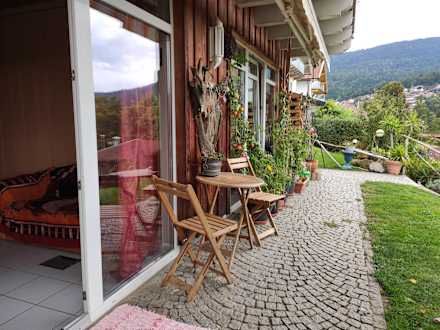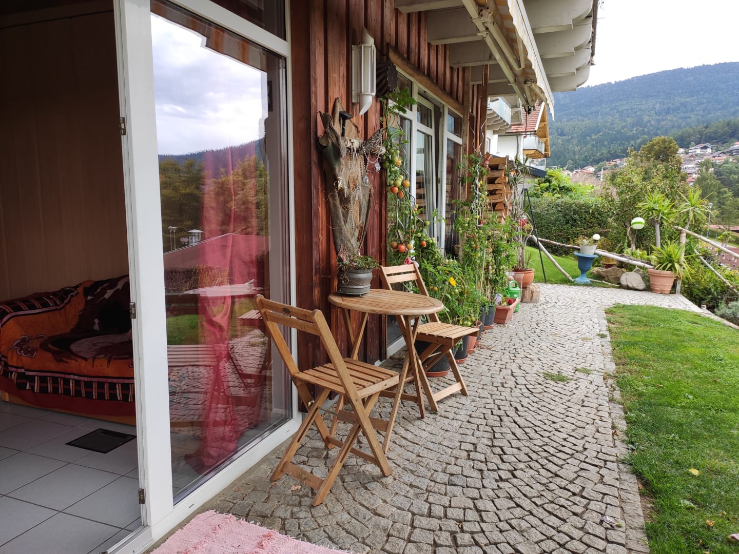 Vor der kleinen Wohnung mit Blick auf die Berge