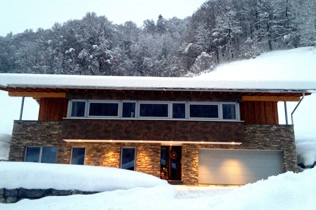 Hausansicht Winter in Abenddämmerung