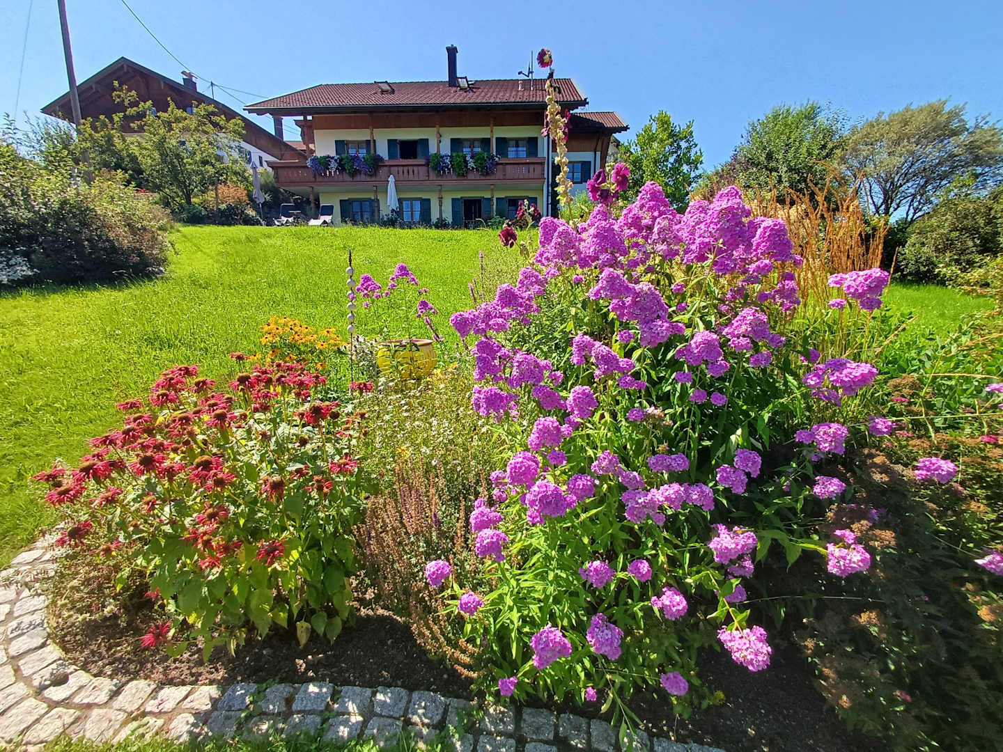 Blick über den Garten zur Frühstücks Terrasse