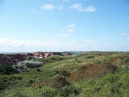 Blick von den Dünen aufs HausBlick auf Loog. Haus Wellhorn ist eines der Häuser in der Bildmitte, kurz vor den Dünen.