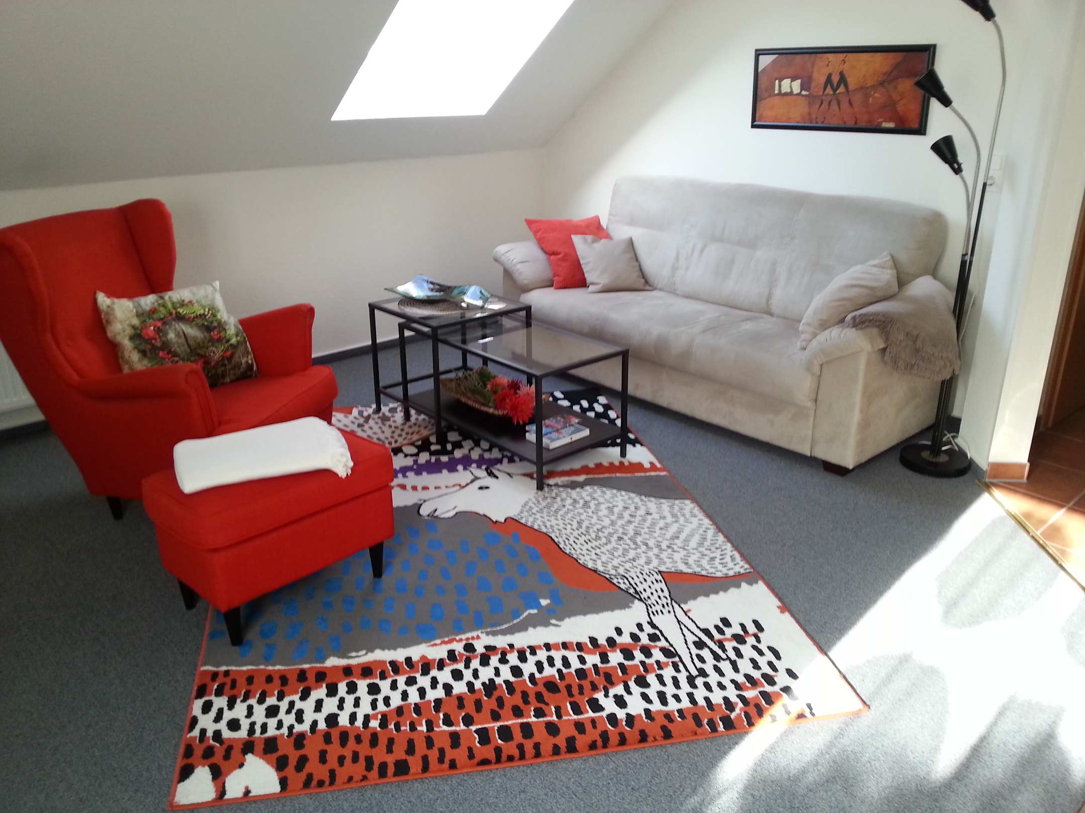 Nochmal die gemütliche Sitzecke mit Couch und Ohrensessel mit Hocker.