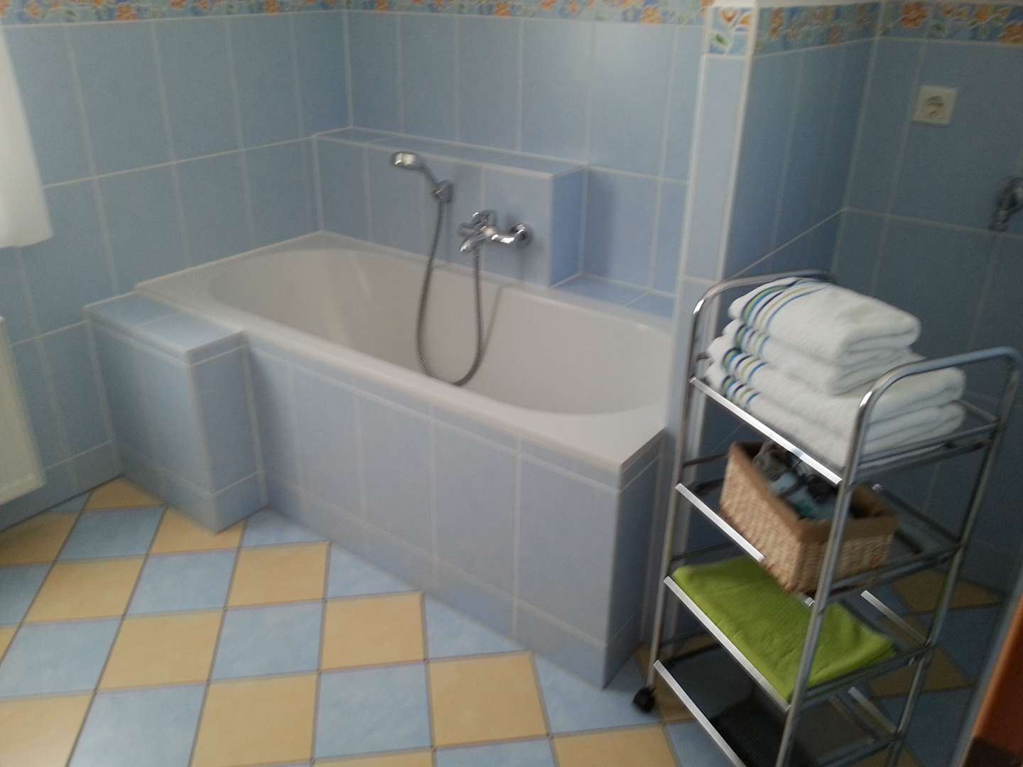 ZimmerDas große Bad mit Badewanne, Dusche, WC und Waschbecken, ausgestattet mit Handtüchern und Duschmatte.