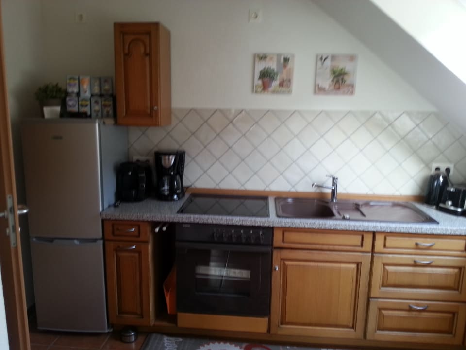 ZimmerDie komplett eingerichtete Küche mit Kaffeemaschinen, Mikrowelle, Töpfen, Geschirr, Besteck und Reinigungsmittel für den Abwasch.