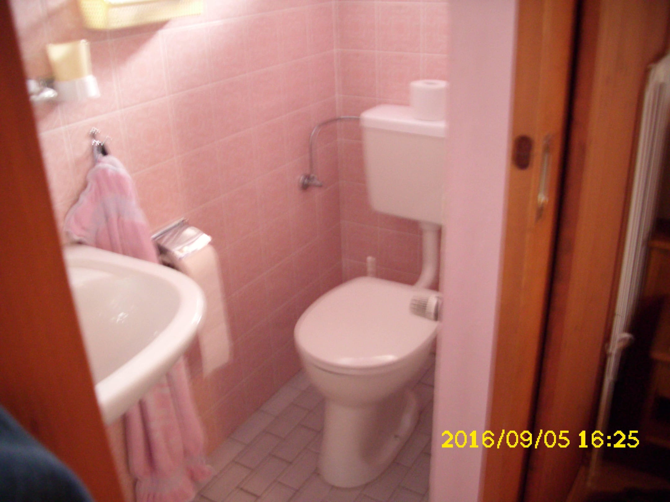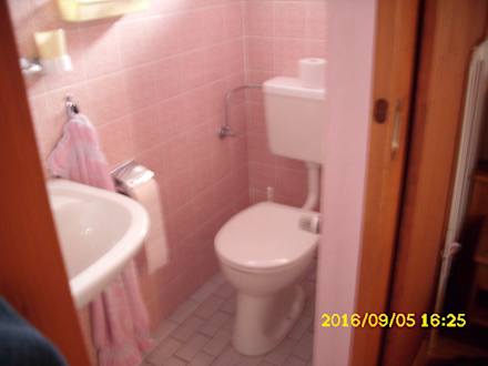 Hier sieht man, das sehr wenig Platz zwischen Waschbecken und Toilette besteht, sowie, dass man sich sein Knie beim Hinsetzen bzw. Aufstehen von der Toilette am Heizungsventil kaputt hauen kann!