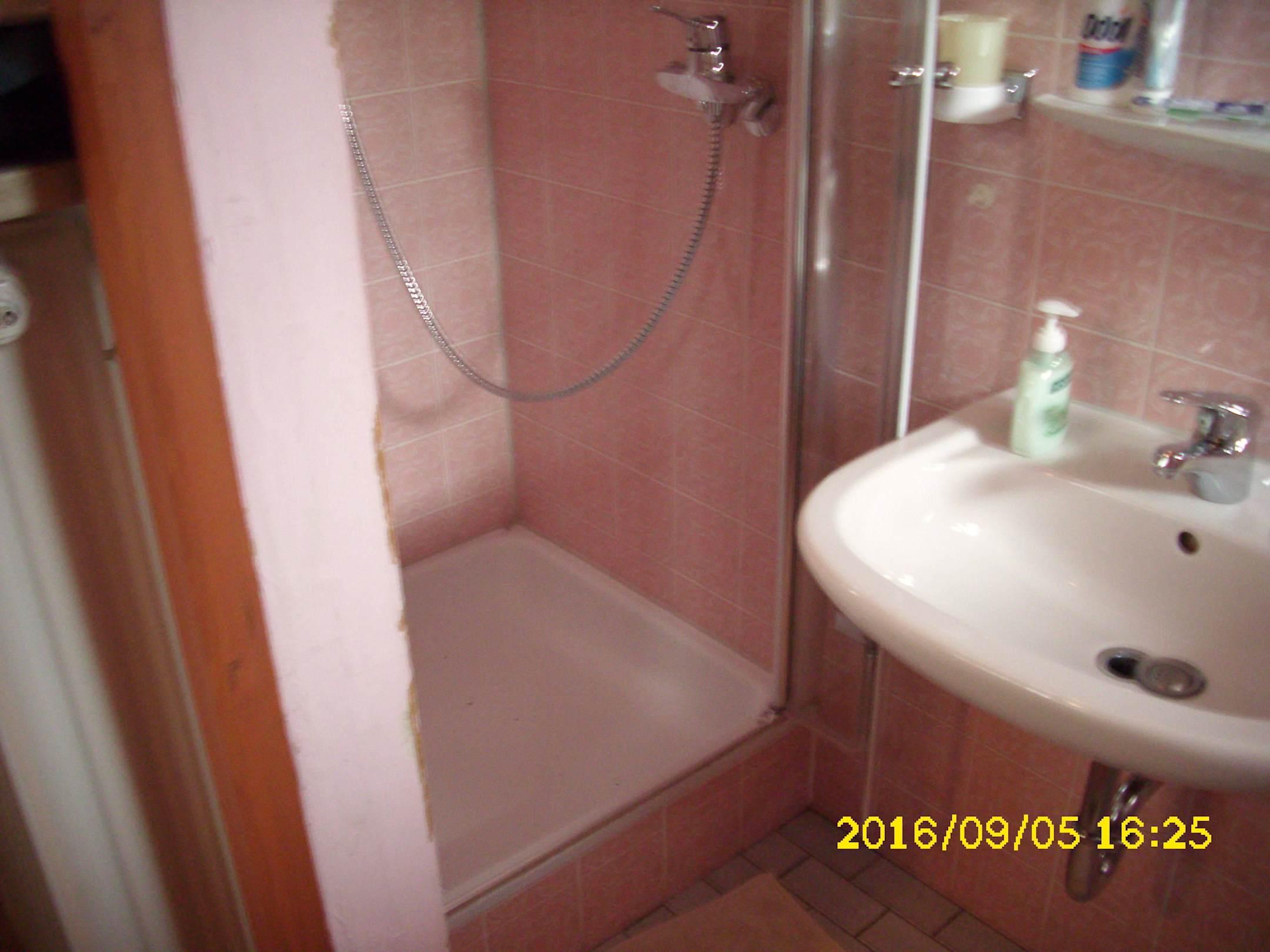 Hier sieht man, wie wenig Platz man hat um in die Dusche bequem einsteigen zu können und wieder heraus zu kommen, da das Waschbecken direkt angrenzt!