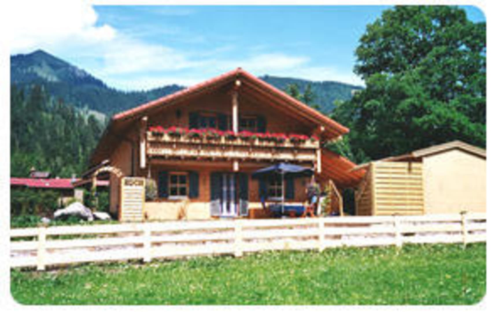 Blick von der Wiese zum Haus. 1. Stock Balkon der Ferienwohnung