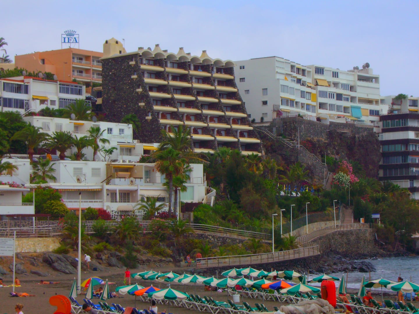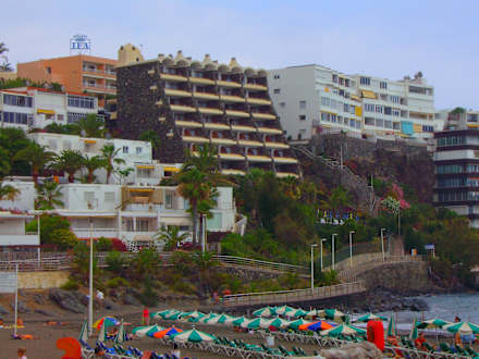 Vom Strand aufgenommen das Hotel Buganvilla