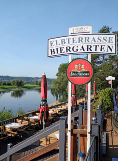 Die Restaurant-Terrasse. Hier legt auch der Elbdampfer an.