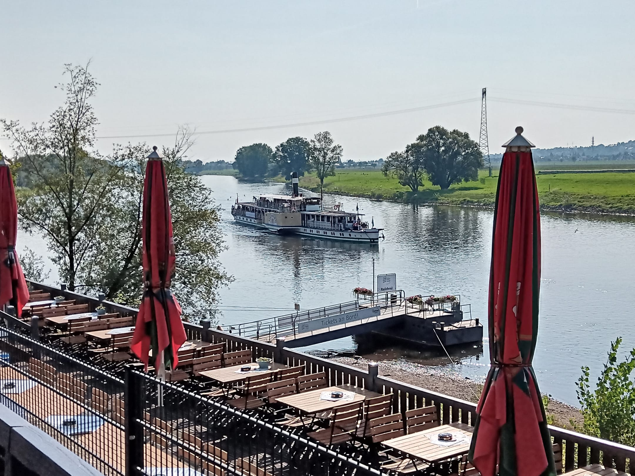 Die Restaurant-Terrasse direkt an der Elbe. Hier legt auch der Schaufelraddampfer an.
