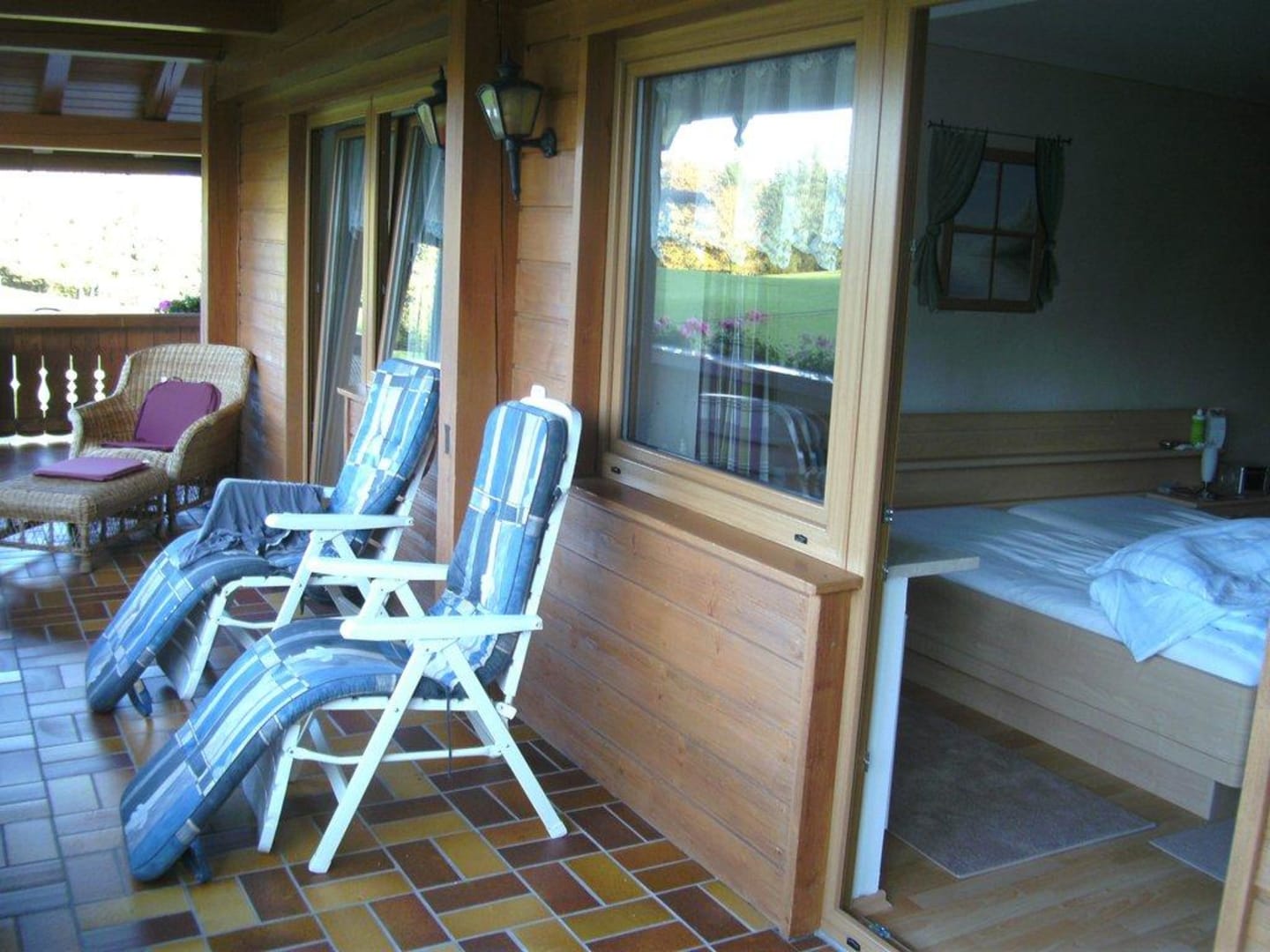 Der große Balkon mit Liegen und Zugängen zu den beiden Schlafzimmern