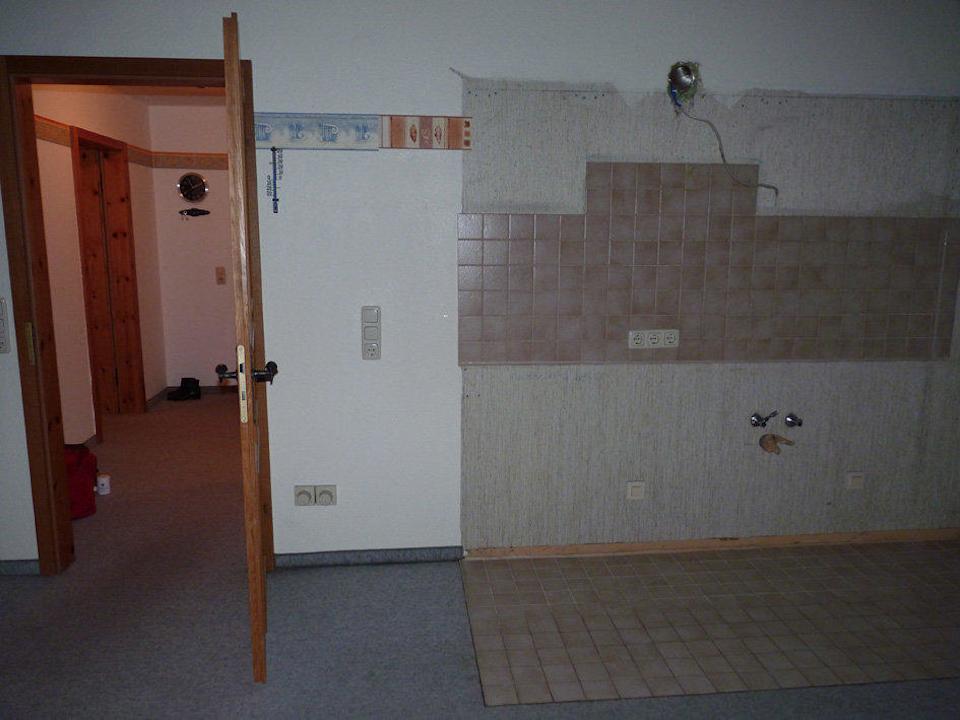 Diese Baustelle haben wir bekommen statt des reservierten Einzelzimmers und des reservierten Doppelzimmers. Man sieht deutlich, wo die Küche gewesen ist. Links von der Flurtür steht das Campingklappbett.