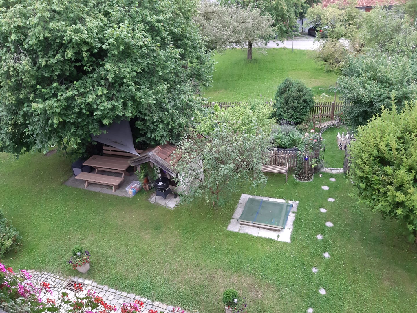 Blick vom Balkon auf Grillplatz und Sandkasten