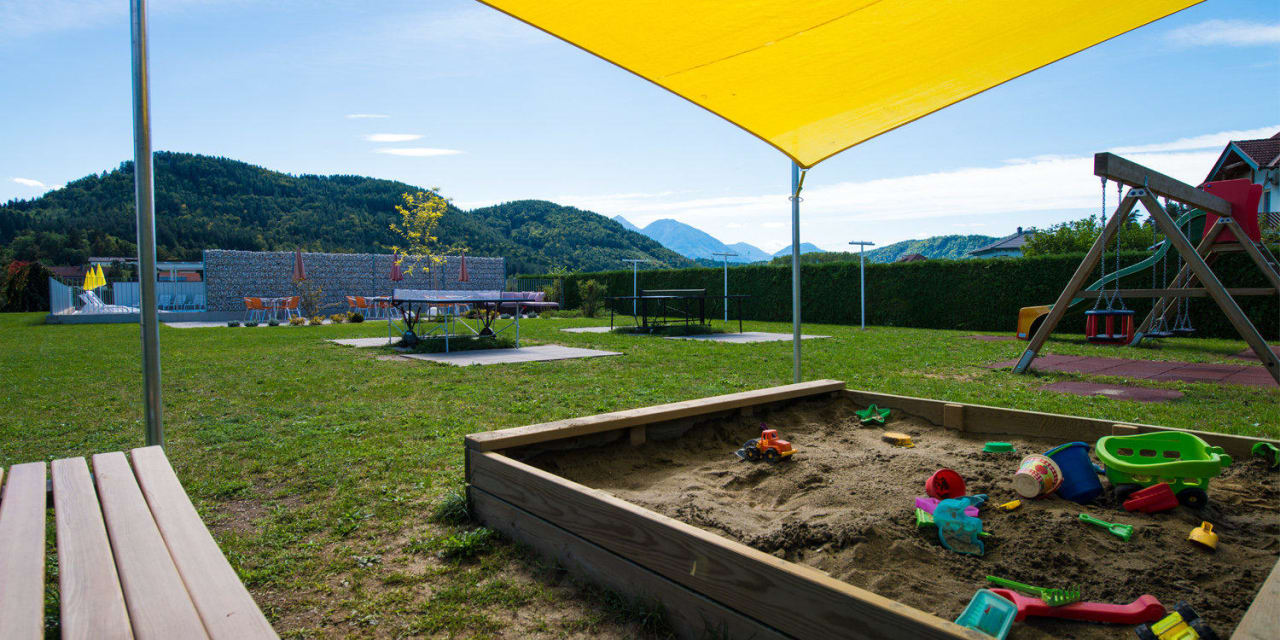 Spielplatz mit Sandkiste, Rutsche und Schaukeln