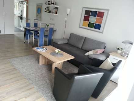 Polster - Garnitur und EssplatzErdgeschoß - Wohnung Wohnzimmer mit Schlafcouch in Komfort-Sitzhöhe sowie Essplatz im Hintergrund